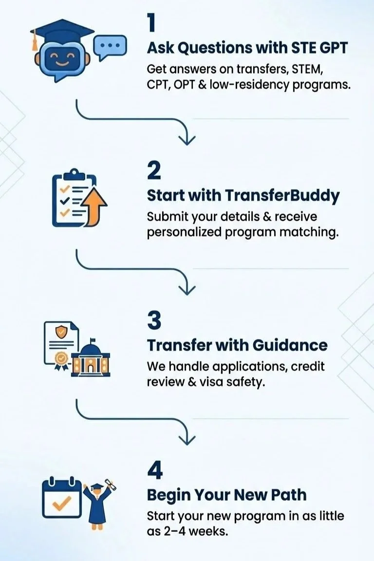 Switch to a better-fit program without risking your visa status. Keep your credits, save time, and unlock scholarships.