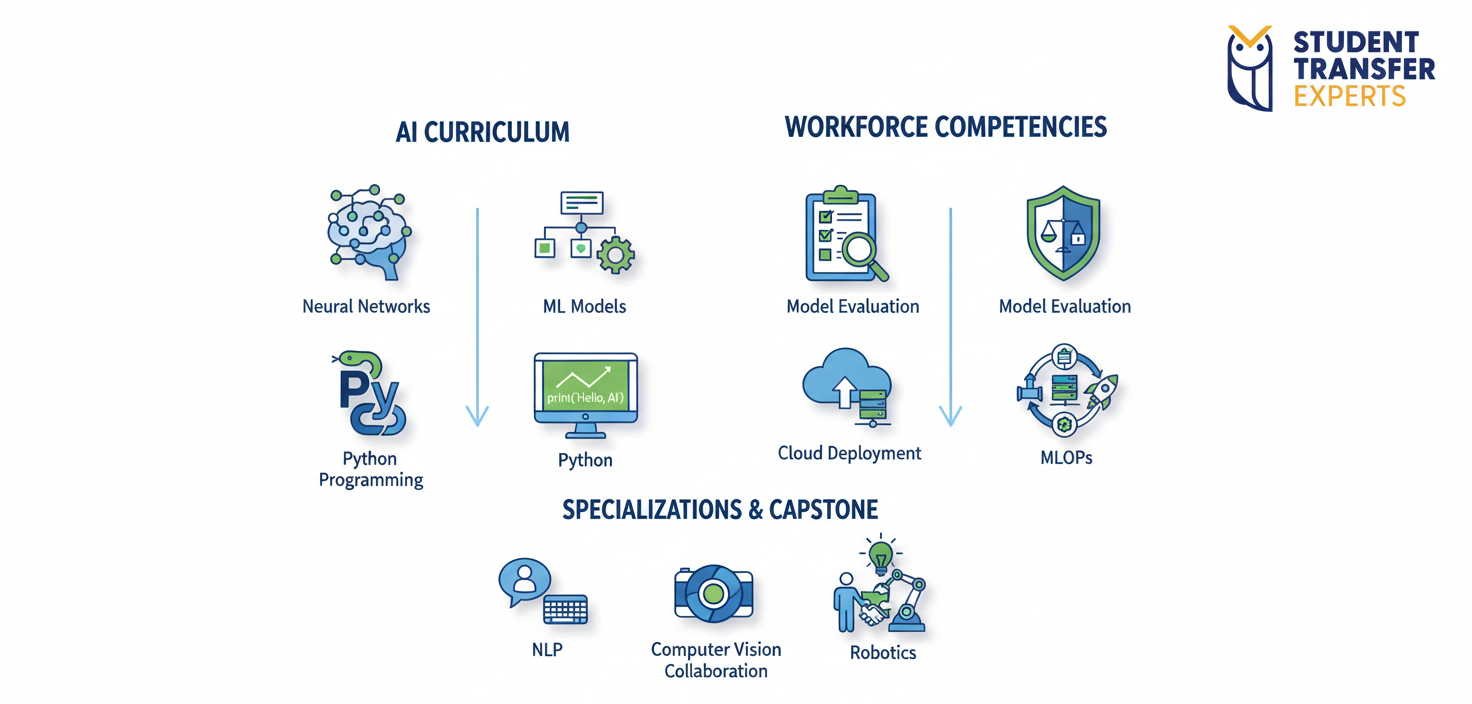 AI programmes are usually less flexible than broad general studies programmes because course sequencing matters. Foundational subjects such as programming, linear algebra, probability, algorithms, and data methods often affect what can transfer smoothly. Even so, students may still be able to optimize their path through:
