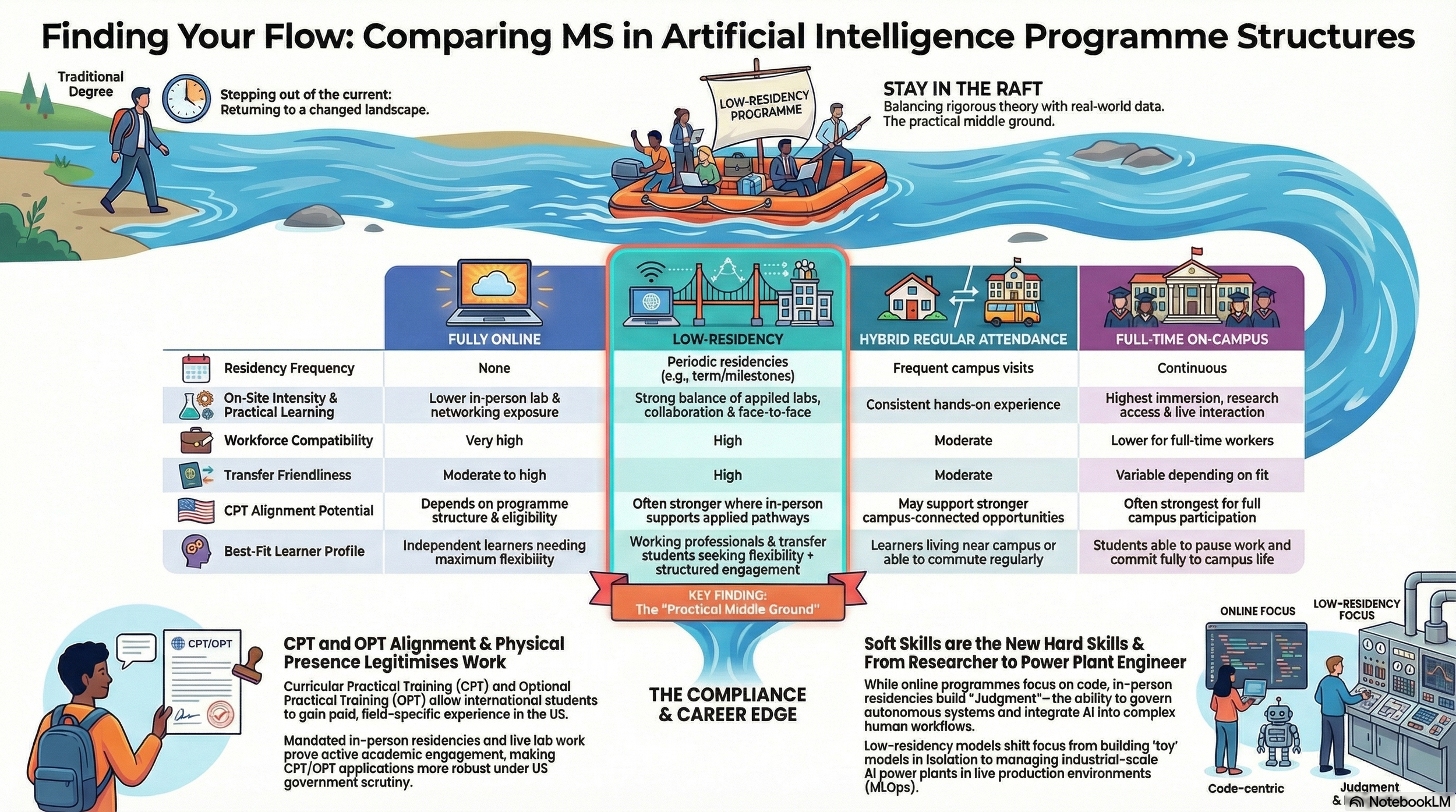 For Artificial Intelligence, low-residency often hits the practical middle ground. It gives students enough in-person engagement for project-based learning and relationship building, without requiring the full lifestyle reset of a traditional campus programme. That balance is especially useful for learners who need flexibility but do not want a purely isolated online experience.