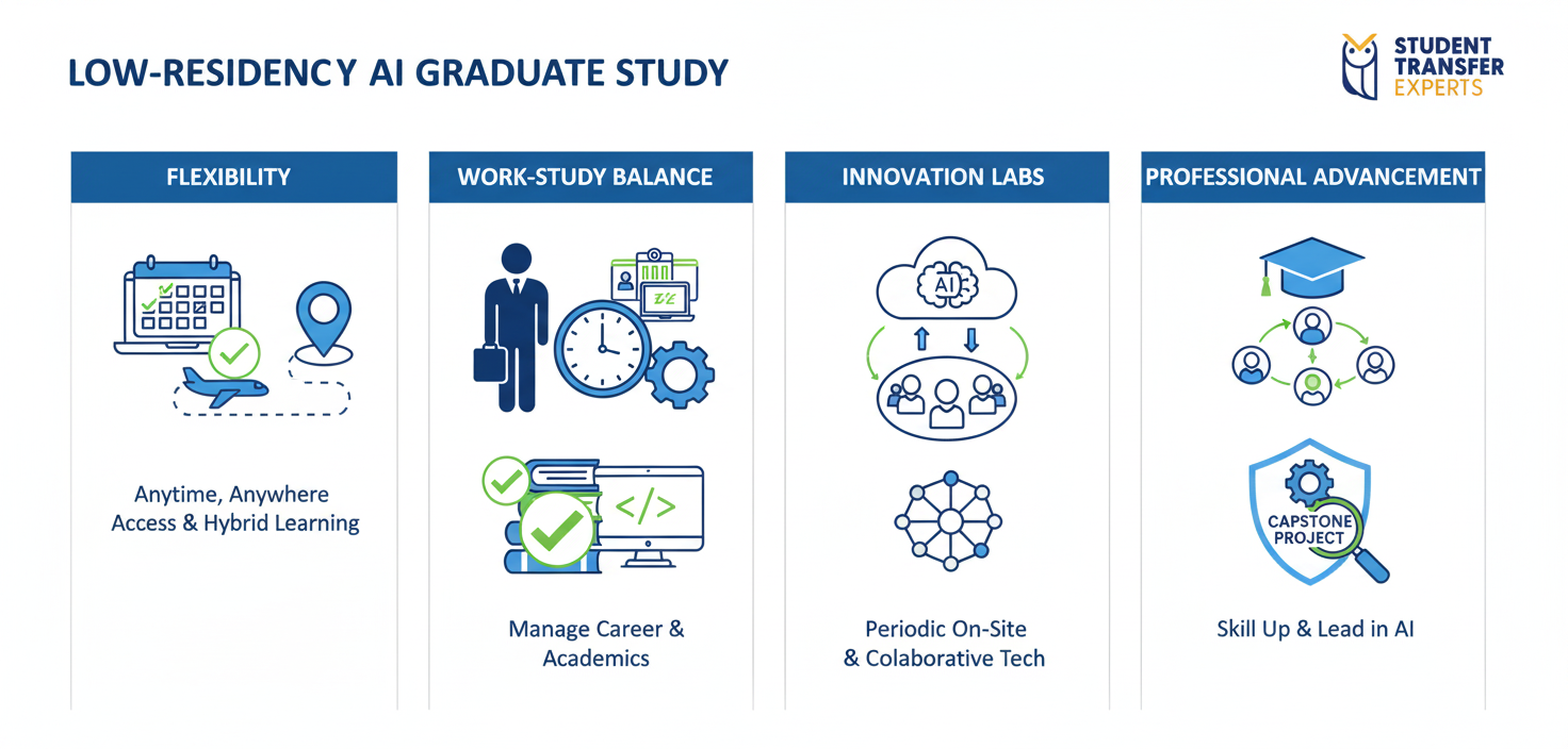 Artificial Intelligence evolves too quickly for many learners to pause work, relocate full time, or separate theory from application. Low-residency models create a more practical pathway: students complete substantial coursework remotely while attending periodic on-site sessions for labs, intensive workshops, collaboration, networking, or project-based learning. For transfer students and workforce learners already in the US, that combination can protect academic continuity while keeping professional momentum intact.