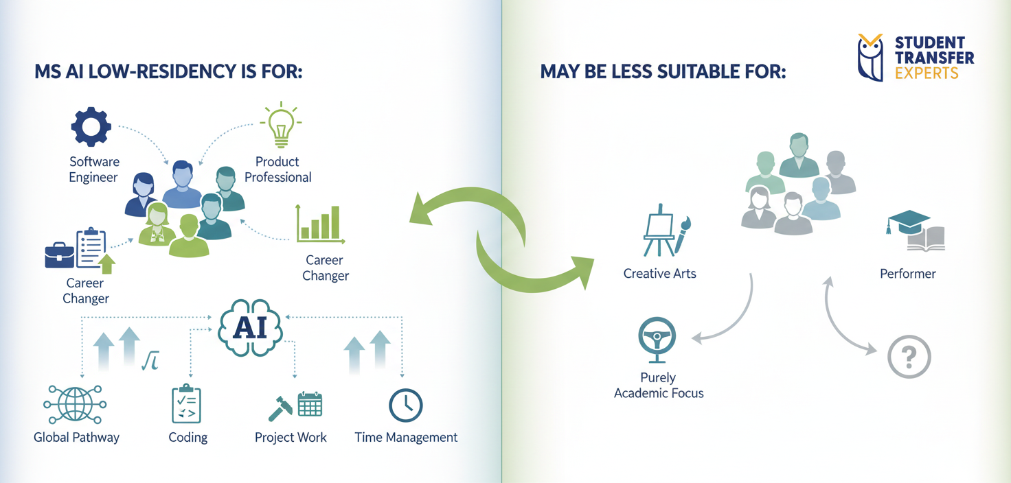 Transfer students evaluating a low-residency MS in Artificial Intelligence should focus on pathway design, not just programme marketing.