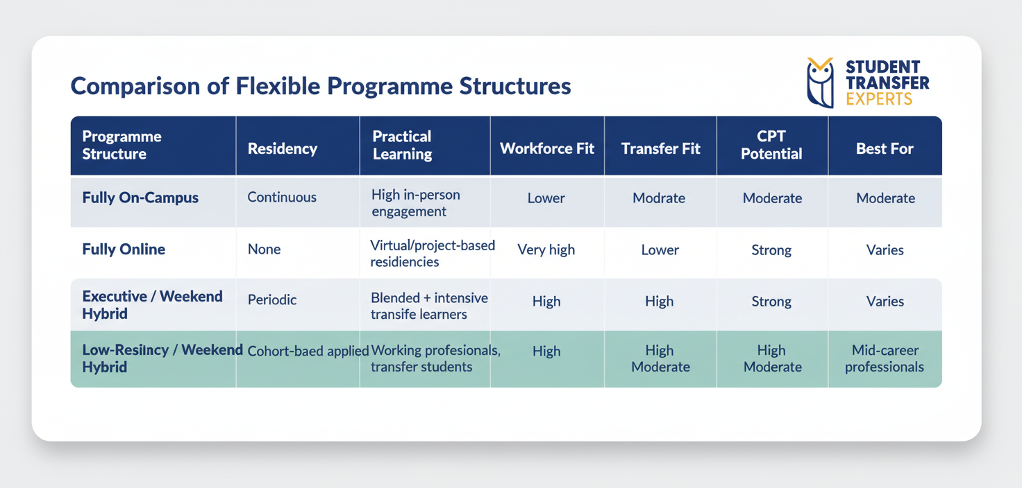 For international or transfer students already in the US, programme format, institutional process, documentation timing, and academic continuity all matter. While this is not legal advice, students should evaluate residency expectations, transfer timelines, I-20-related processes where relevant, and internship planning early. A strong advising process can help students ask the right questions before making a move.