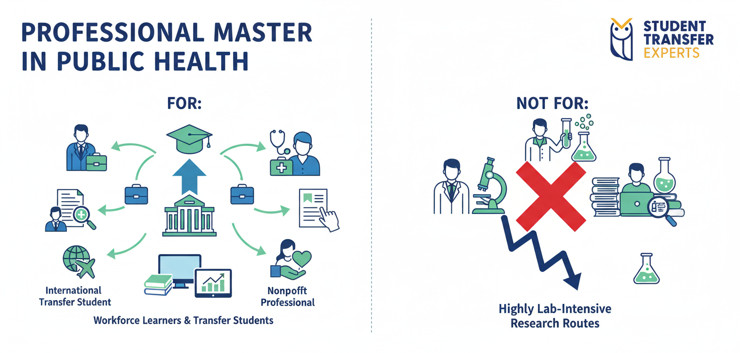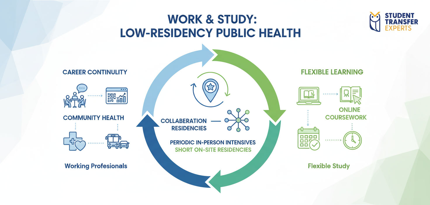 A low-residency Professional Master’s in Public Health can be particularly useful for transfer students already in the US because it supports both academic continuity and career alignment.